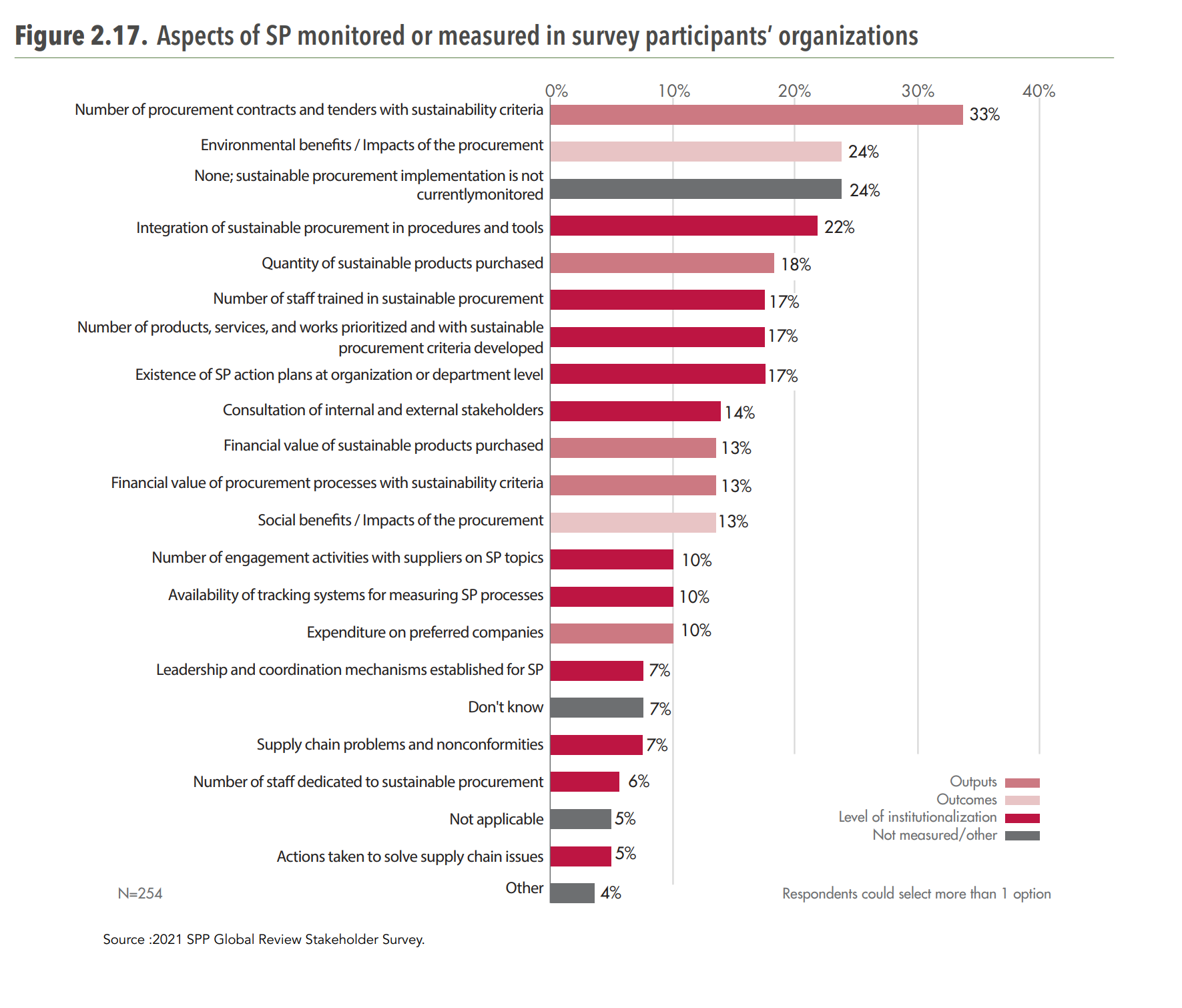 The following survey results by the 2022 UN Environment Programme Global Review demonstrate the single largest measurement available is just how many procurements have some kind of sustainability criteria at 33% of respondents. 24% have no measurements at all.