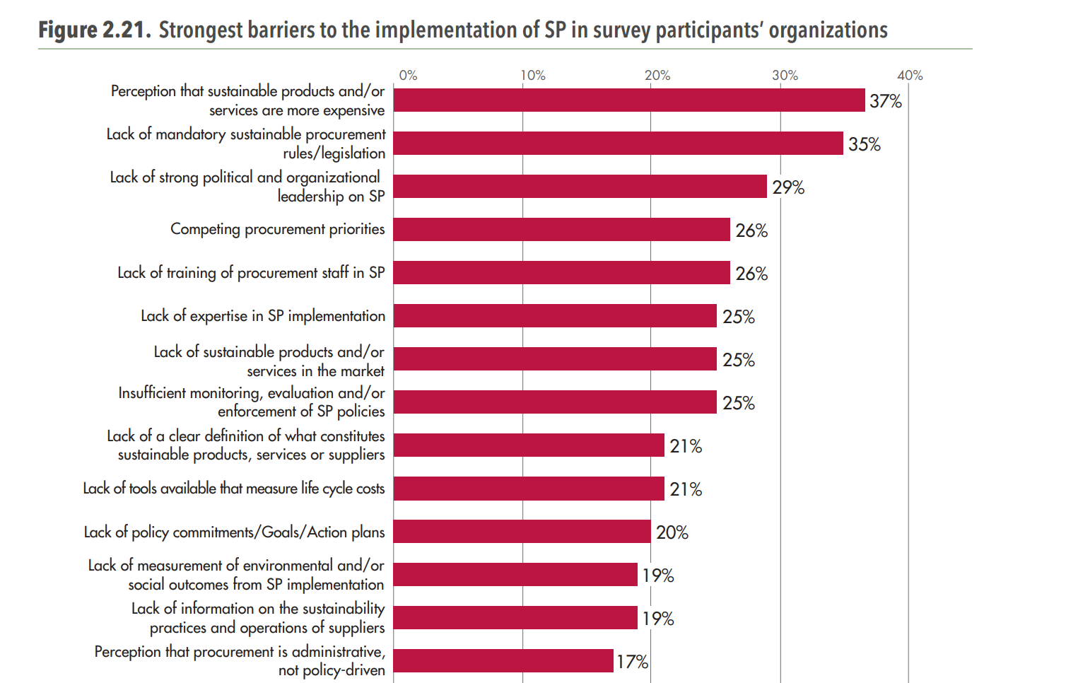Fortunately, we have this data too. The following survey results from the same UN report identify the strongest barriers to implementing sustainable procurement in organizations. The results have been truncated to the top 14 (over 23 reasons were given).